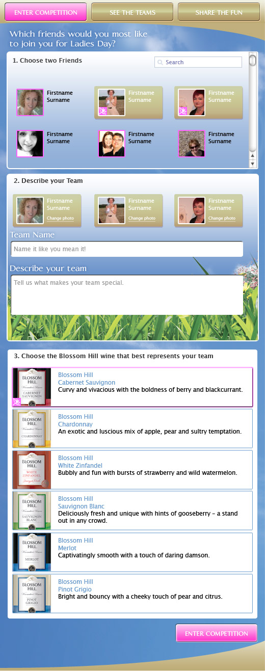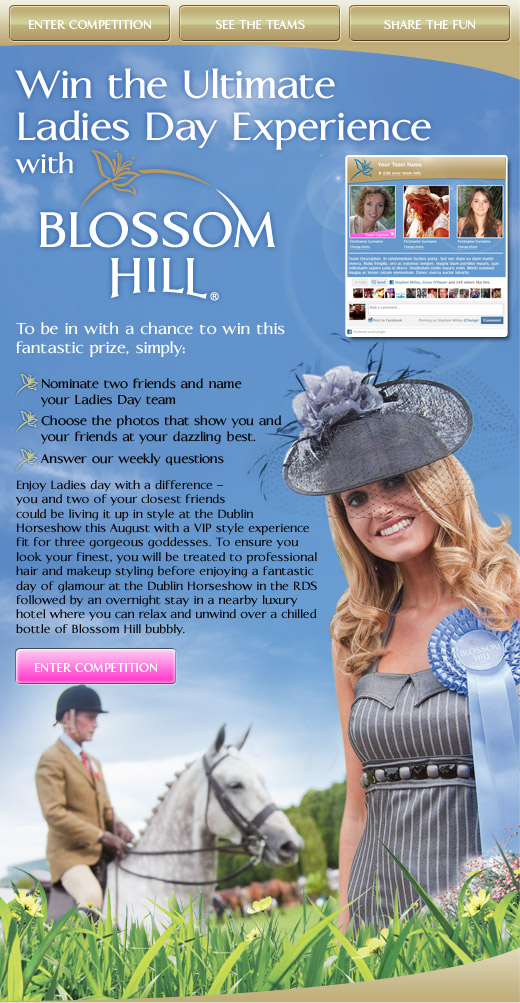 Blossom Hill, in addition to producing a fine selection of popular wines, also sponsor ‘Ladies Day’ at the Dublin Horse Show. To help promote this, we were asked to create a Facebook app to engage and reward Blossom Hill fans. Knowing that people generally like to share photos on Facebook – whether they are ones that capture them at their best, or allow them to get a bit of banter going back and forth, we built the activity around sharing photos from existing facebook photo albums. The team-centric structure ensured that everyone was encouraged to invite more people in and the reward at the end was well worth staying involved for the duration of the promotion.