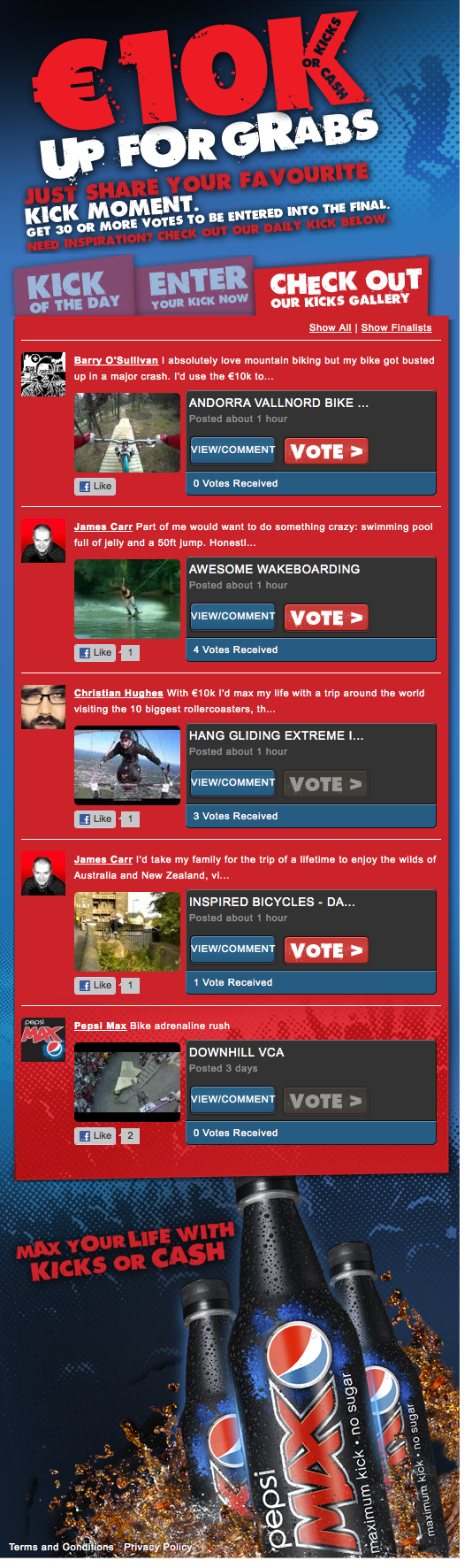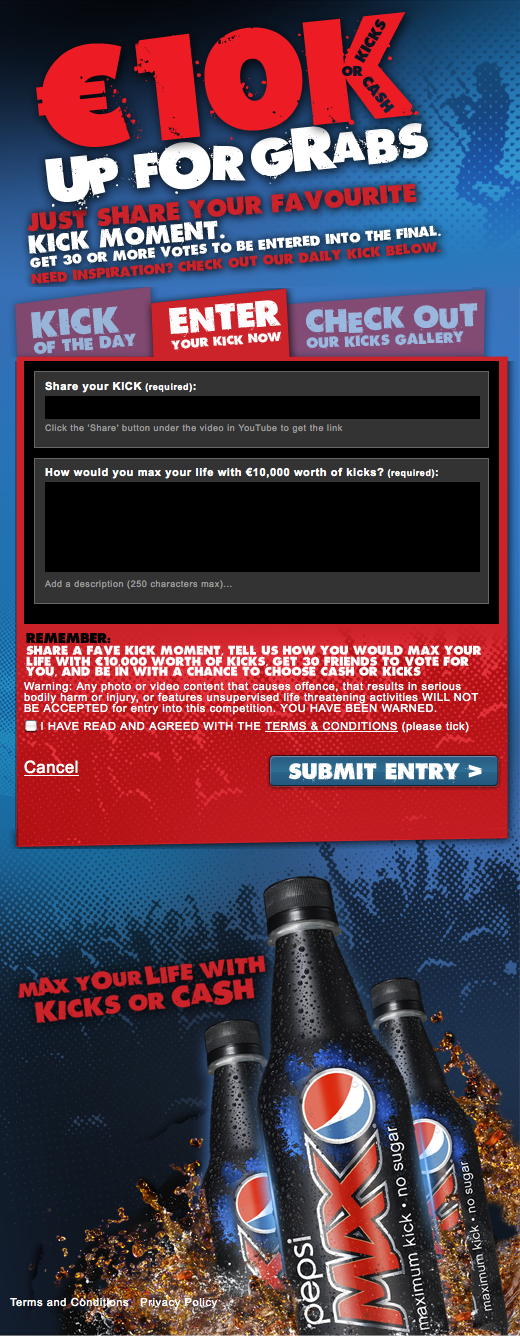 Pepsi Max wanted to launch their Irish Facebook page with an attention-grabbing promotion, so we offered a chance to win €10K worth of Cash or Kicks. Entry is easy – all you have to do is submit your favourite adrenaline-pumping video from YouTube and tell us what you’d do for kicks with €10,000 to spend. The promotion was supported by press, POS and online banner advertising.