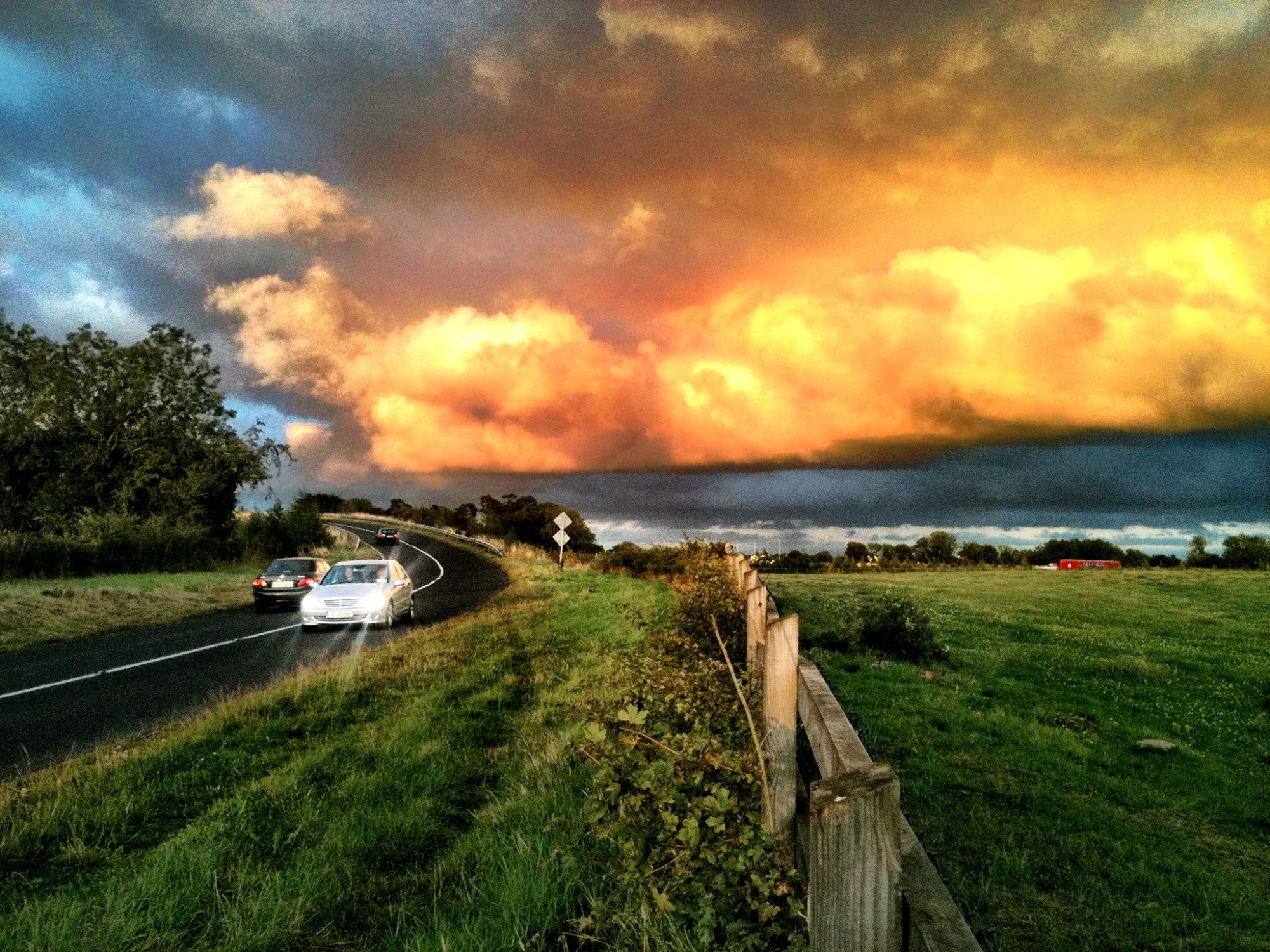 Ok, so I’ll admit I have bumped up the saturation and sharpness a little, but I haven’t adjusted the colour of any specific area of these shots. I was driving from Ratoath to Ashbourne via the Ballybin road a couple of weeks back as sunset approached. I just HAD to stop the car and take a few shots of that crazy orange band in the clouds. I watched lots of other cars go by, but the drivers didn’t look like they noticed anything unusual. These were taken with an iPhone 3Gs and processed with the Camera+ app.