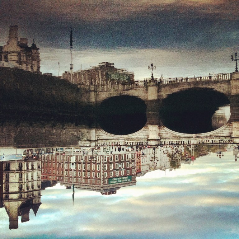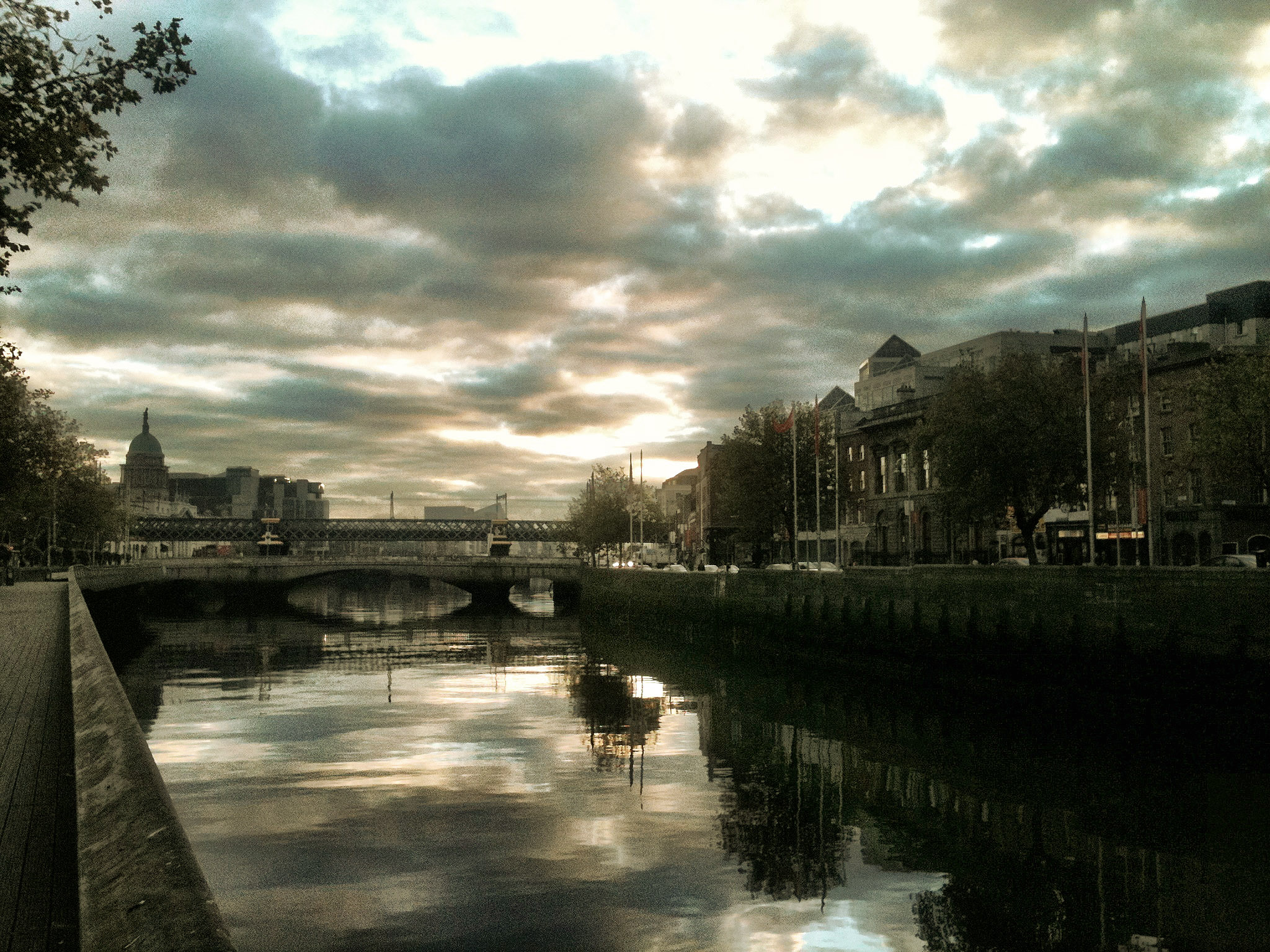 I was on the bus this morning. The view was incredible. Meath looked gorgeous – thick mist hanging over the fields with beams of golden sunlight burning through. Trees, hedges, farm buildings fading out to white nothing. Lovely. But. Between the movement of the bus and the slimy dirt of the windows, it wasn’t worth taking a shot. So instead, I took a few on the liffey boardwalk when I got into Dublin. Not as good, but kinda nice all the same.