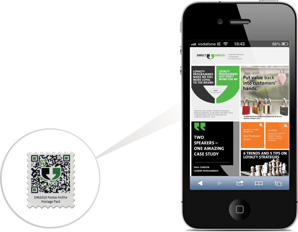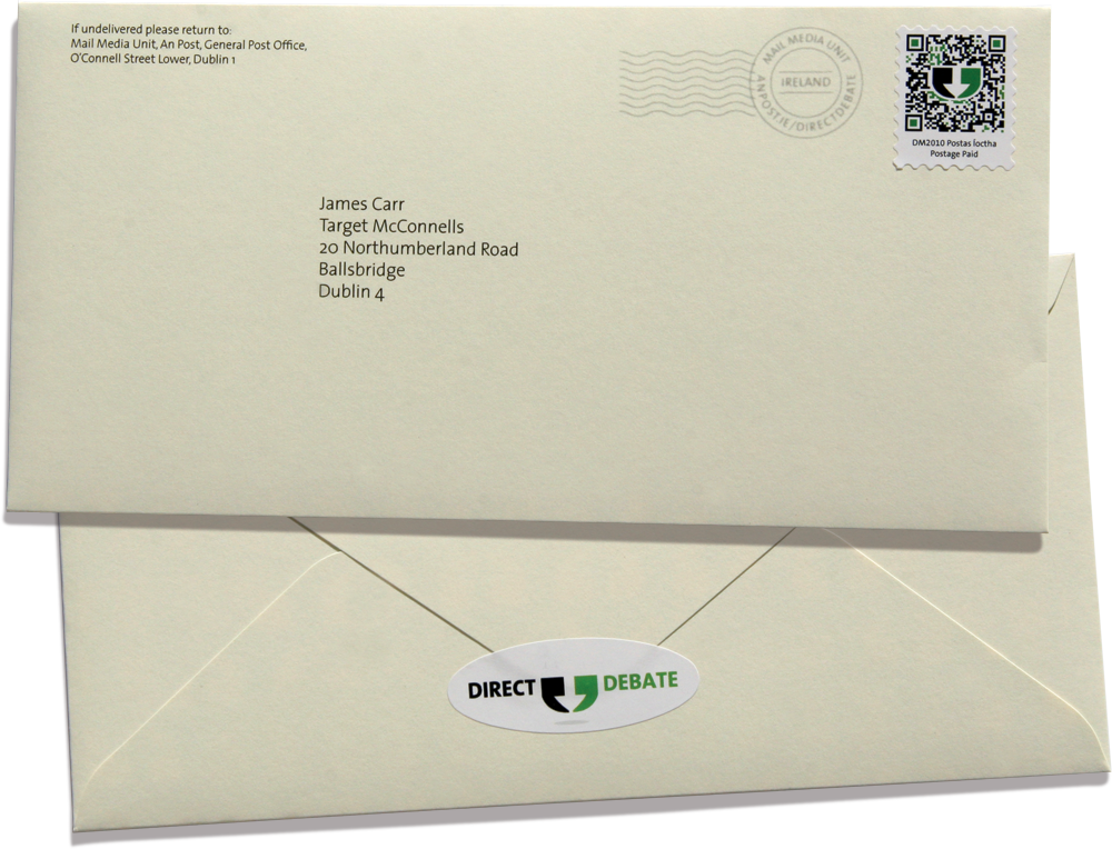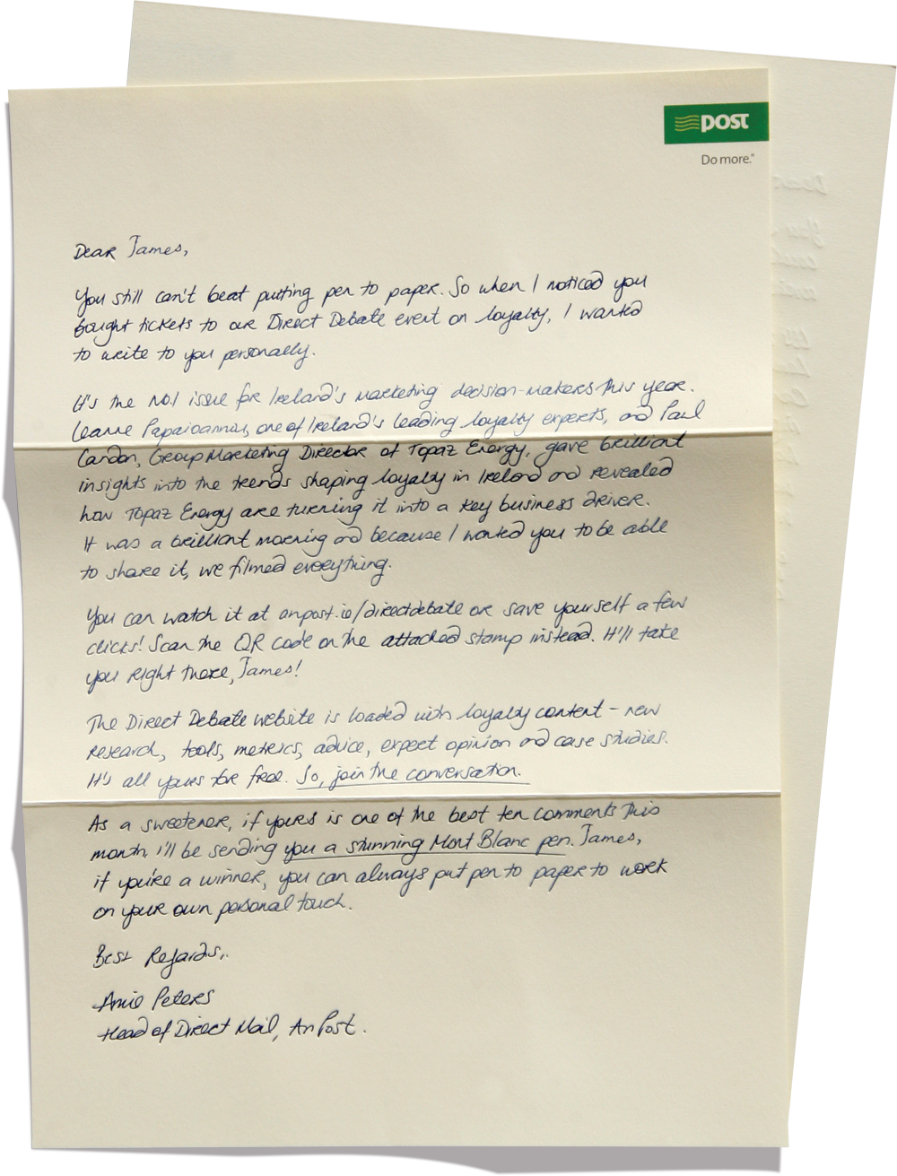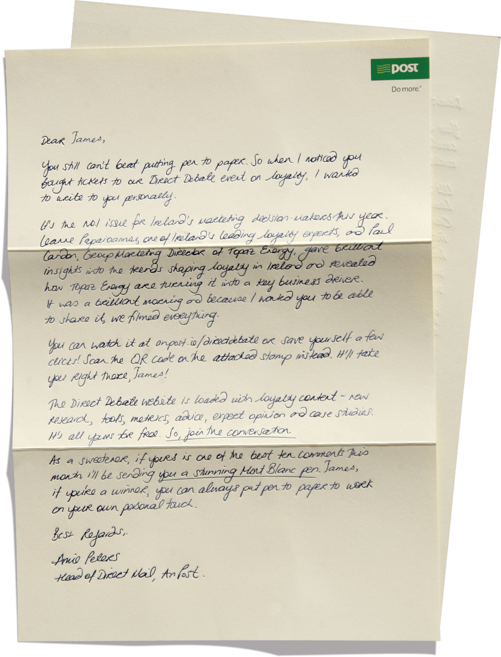 custom-made envelope with a custom-made QR code stamp and postmarkQR code links directly to the event page on the Direct Debate websitean elaborate process of handwriting the letters and complete database of names, followed by digitising the text and producing finely detailed emboss platesPersonalised ‘handwritten’ letters were produced in two versions tailored to audiences who had attended, and to those who had missed the event.