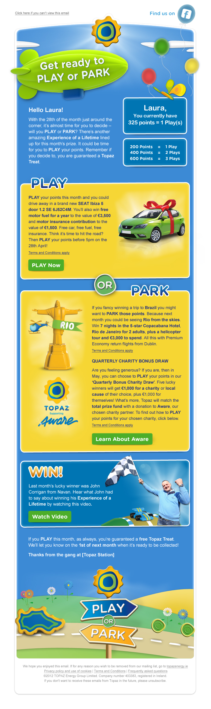 Integrated campaign for the launch and roll-out of Topaz Energy’s loyalty game, Play or Park. The campaign consists of TV (with Ireland’s first use of Shazam in a TV ad), radio, DM, eDM, App development, digital display, outdoor and POS. I worked on the initial pitch and on the campaign development and roll-out over the first 18 months or so.