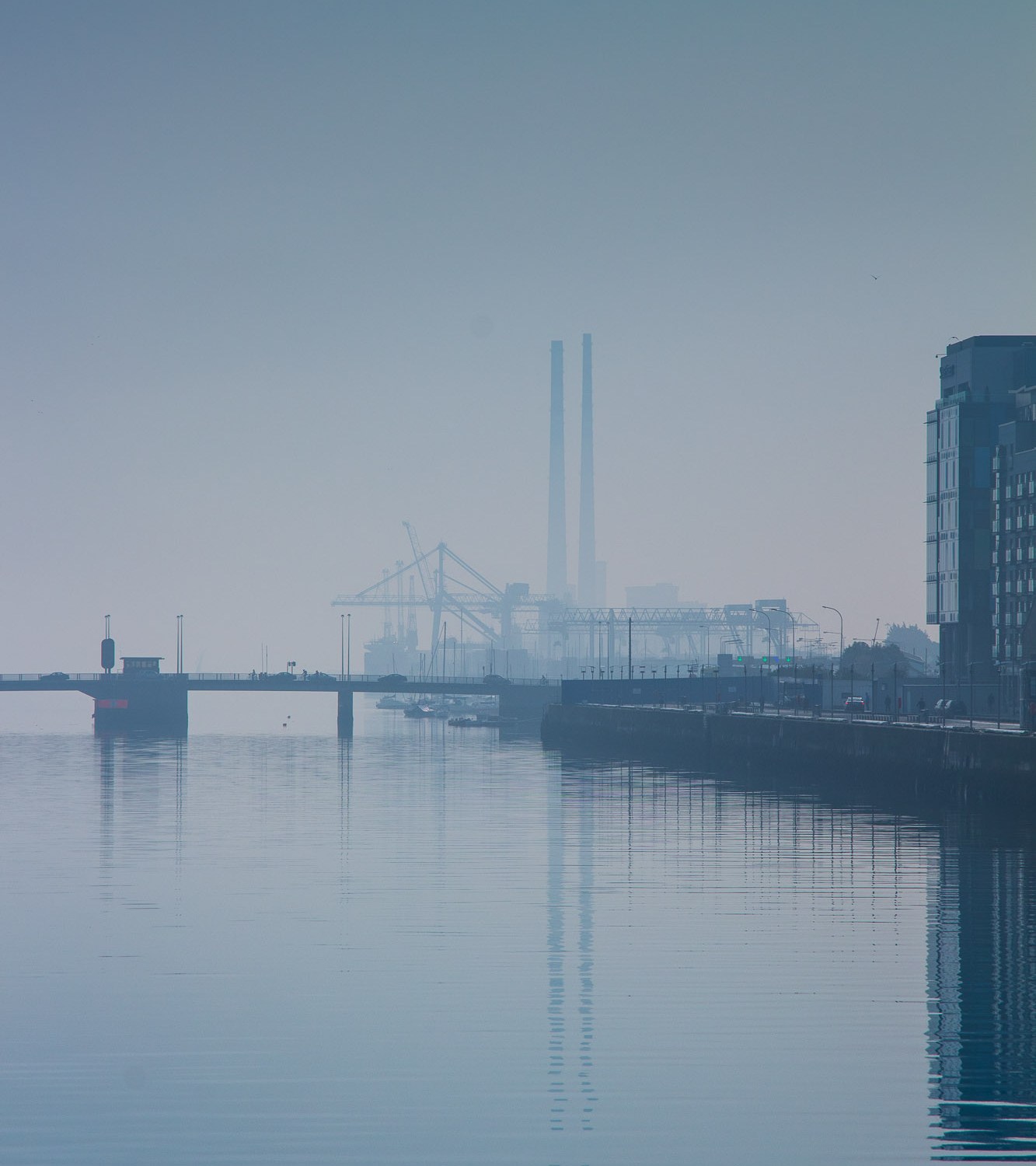 I took these shots this morning from Dublin’s Samuel Beckett bridge. The sombre tones of Dublin’s skyline, with the Pigeonhouse towers in the distance, like ghosts in the mist, seemed a fitting scene for me to pay my respects.