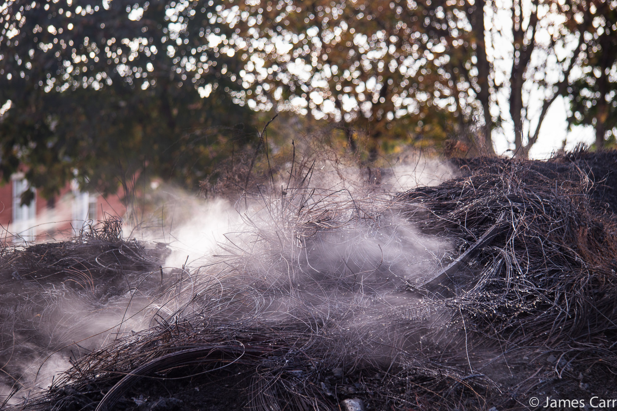 It was a beautiful, crisp day today, so I headed out at lunch and walked down as far as Sandymount strand. I was aiming to take a shot of the Pigeonhouse towers, with the added benefit of some fresh air away from my desk. I got sidetracked along the way at Aviva stadium (see separate post) and when I reached the strand, I found the remains of what must have been a monster of a bonfire. Still smouldering away four days after Hallowe’en.