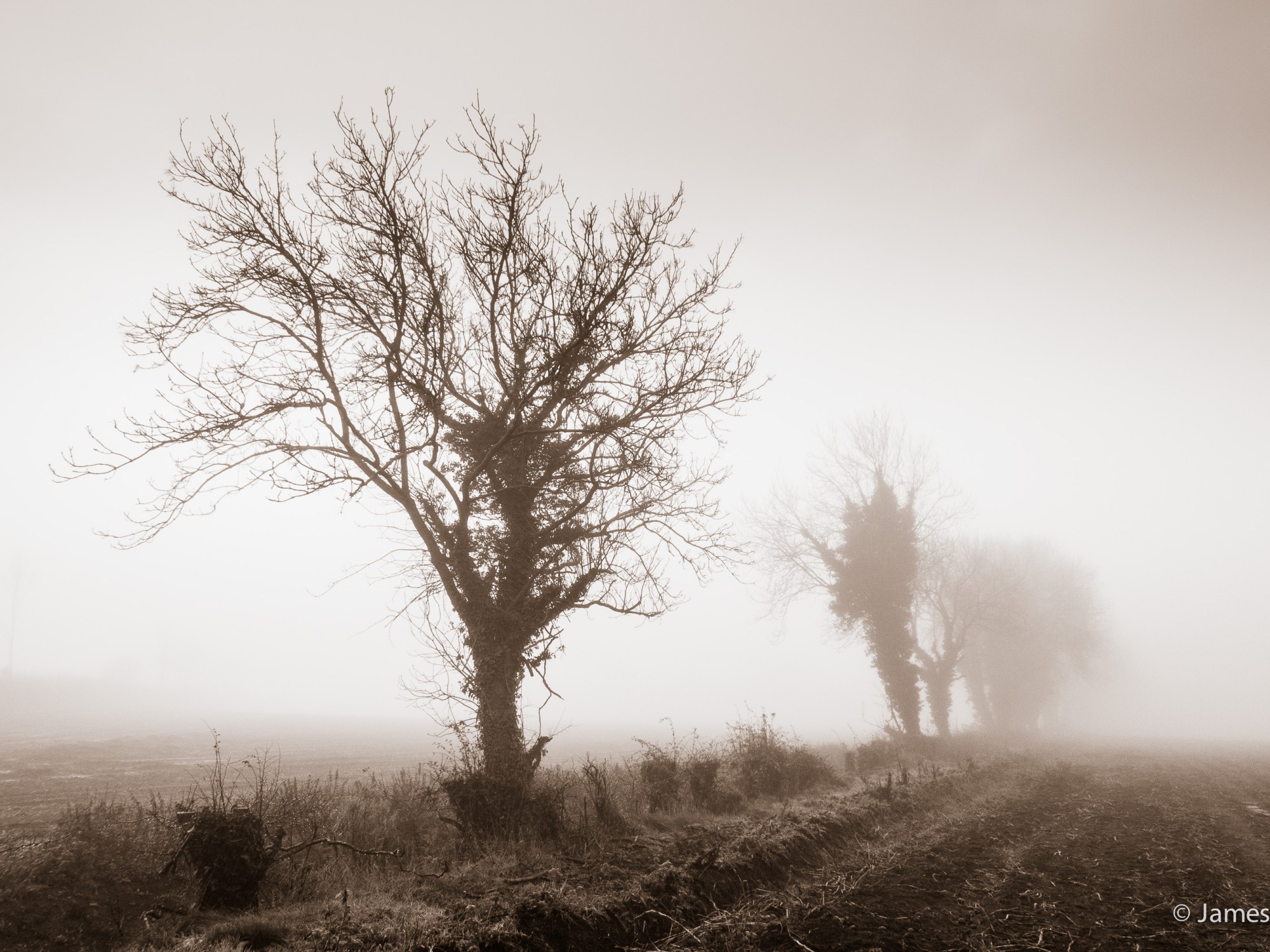 Stopped to take a few shots on the way to work today. I had to be careful not to wander too far into the fields. The fog was that heavy, you could easily get comfortably numb. Luckily, the trees stood their ground and marked the way back.