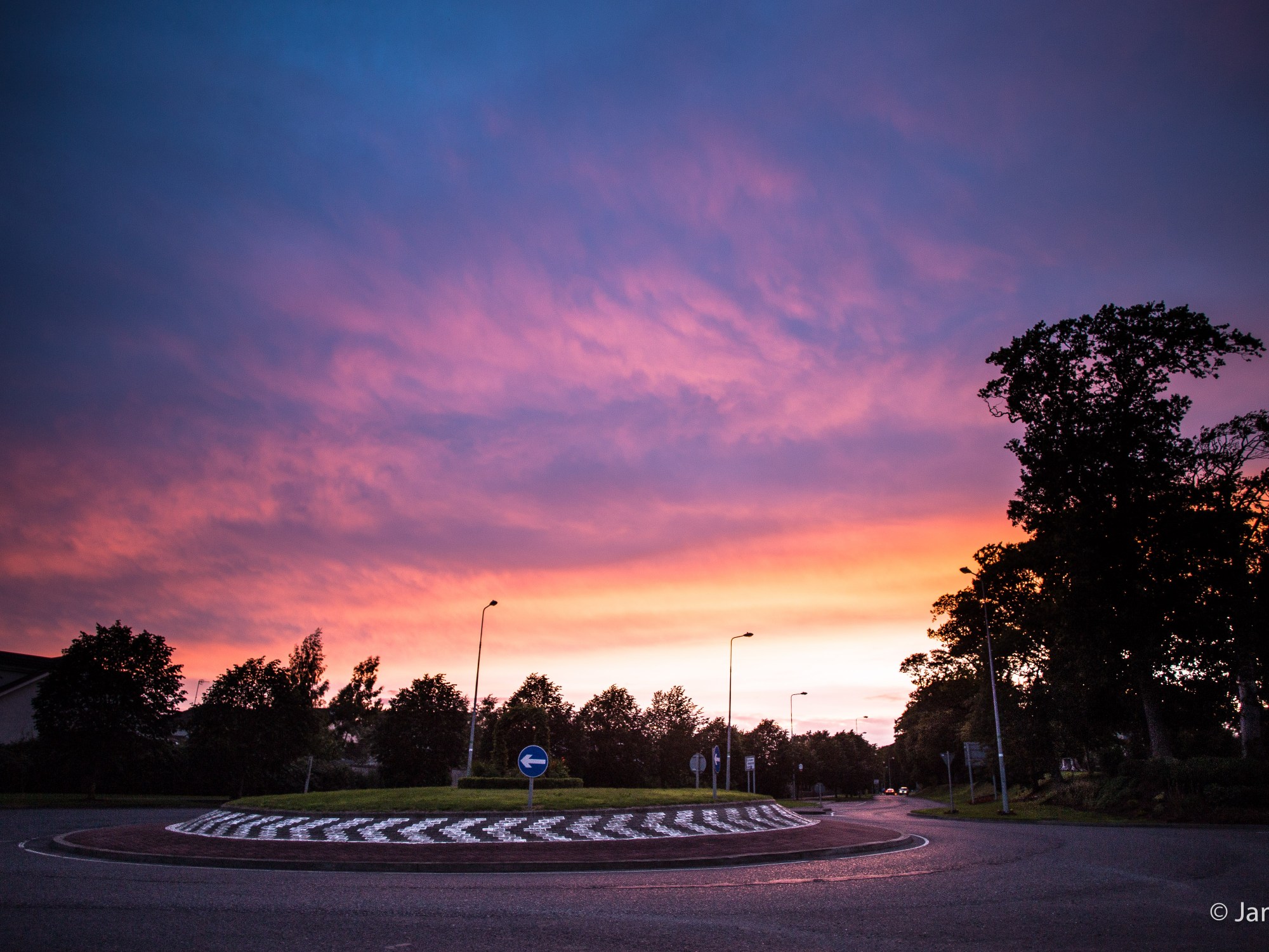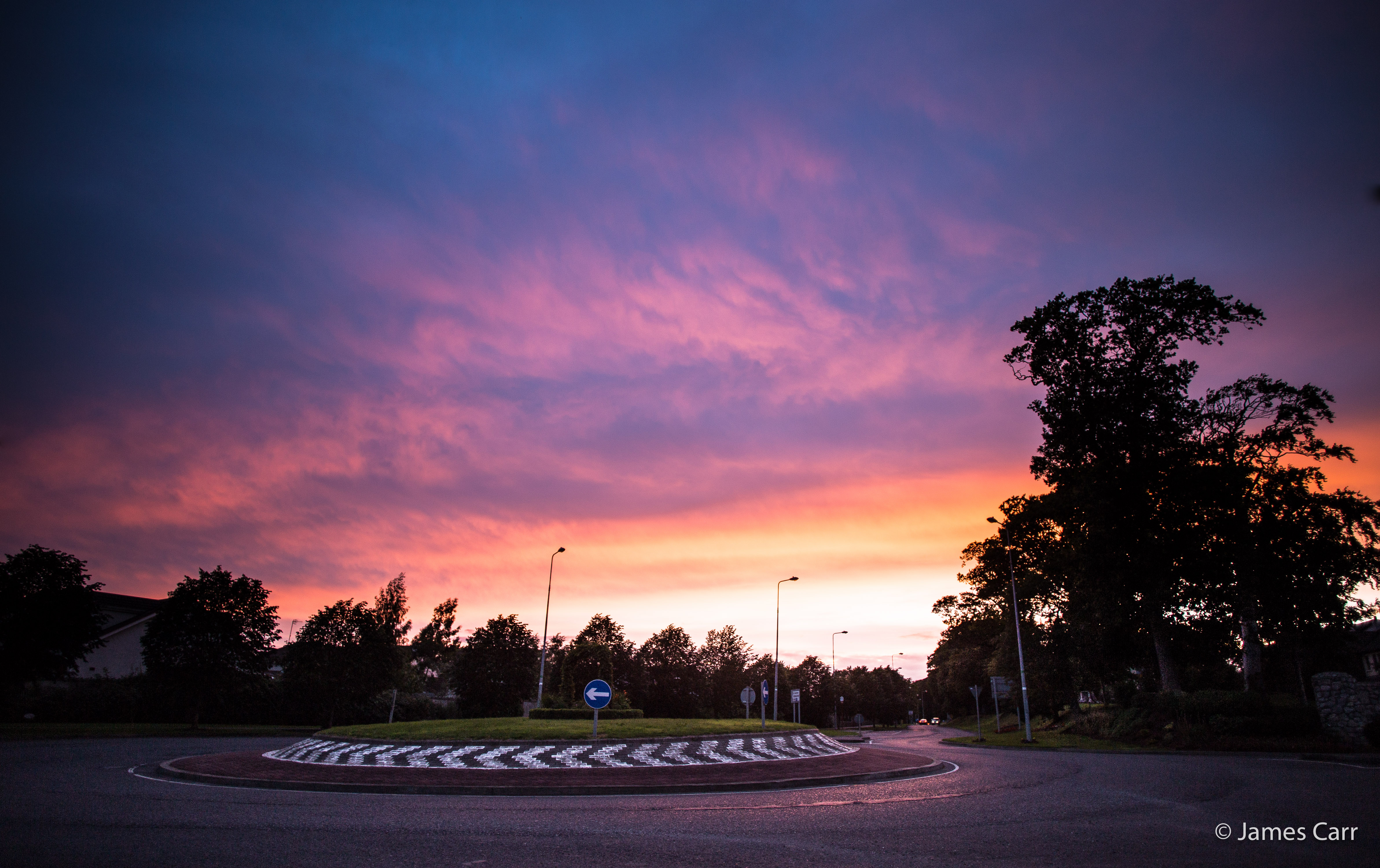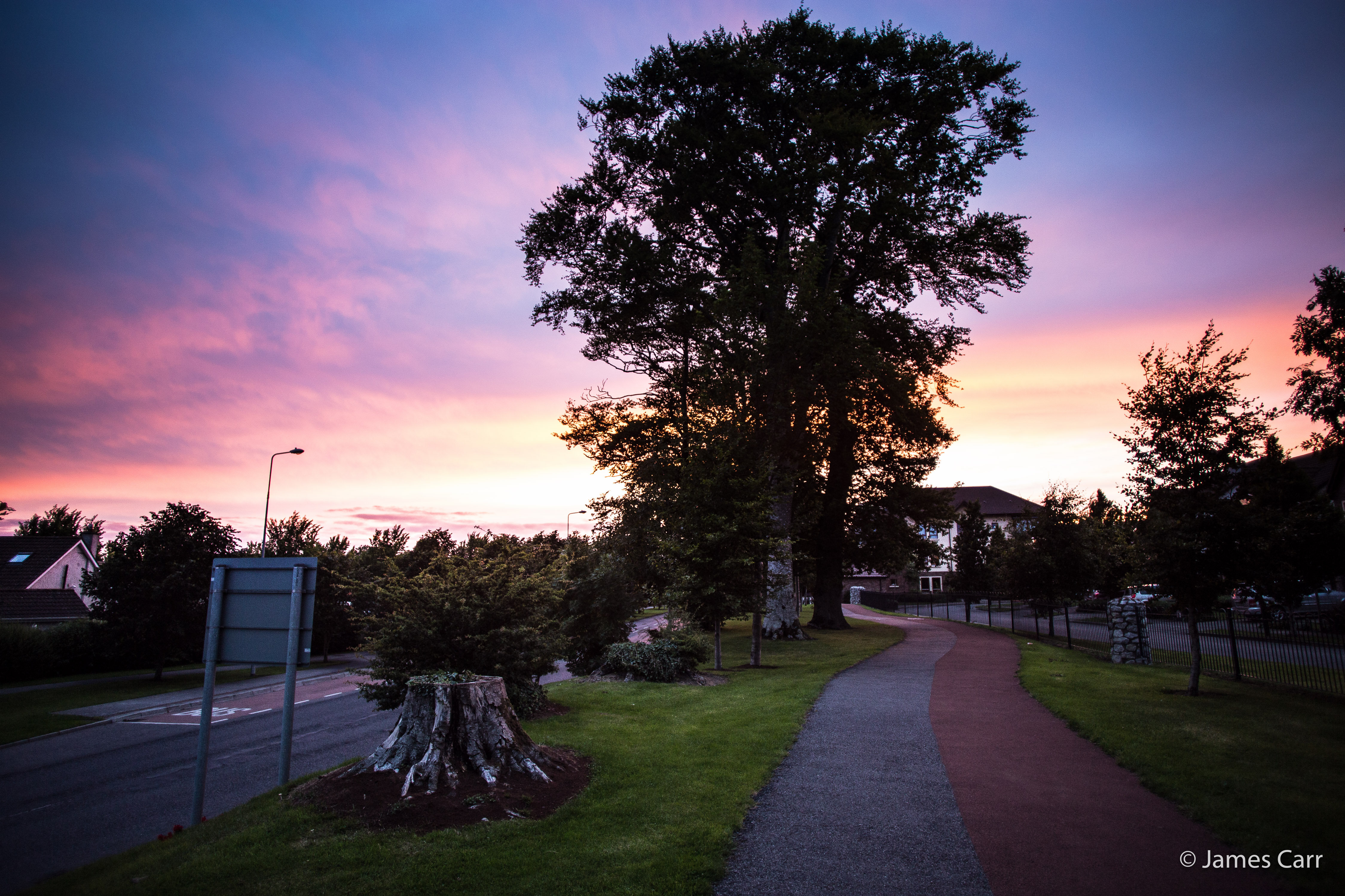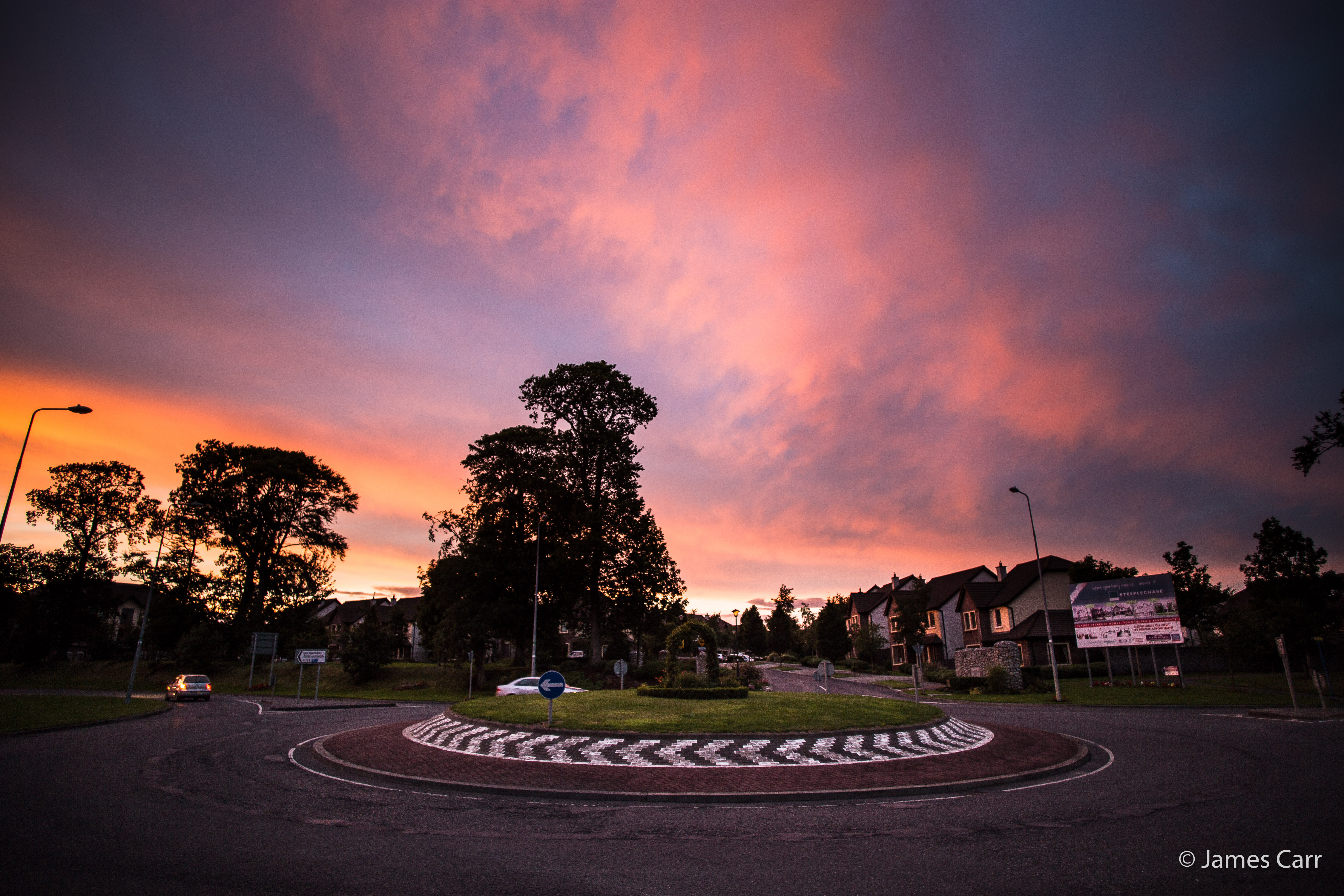 Last tuesday evening, I was sitting in the kitchen at about 9.15pm when I noticed that the garden was pink. Moving closer to the window, I could see the incredible sky that was casting the warm tones. I thought to myself what a shame it was I hadn’t gone out with my camera earlier. Then I thought – feck it – I’ll grab it now and run out to the road and take a couple of snaps anyhow. The sun was going down quickly. I hopped over the garden wall and out to the roundabout on the other side, took a couple of shots there and then headed up the road as quickly as I could walk, aiming to catch the sunset over the fields. I didn’t get there in time, but I got some half-decent shots anyhow, using my iPhone (with the EOS app) as a remote and some fence posts as a tripod.