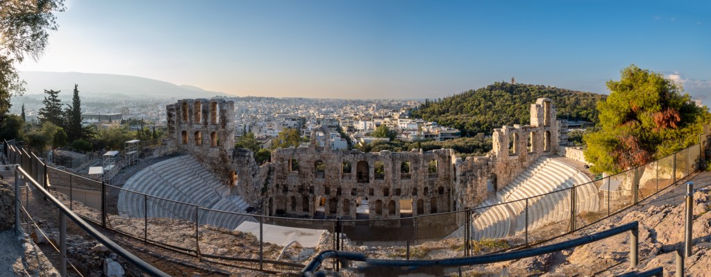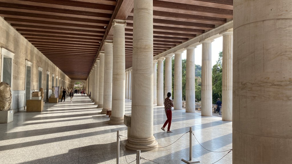 I had the pleasure of spending a week in Athens, Greece in October. Not all of it looked this pretty, the area our hotel was in was particularly grotty, but the weather was beautiful, and there was a lot to see and do. It’s a shame the ancient ruins are so, ruined. But it’s still awe-inspiring to stand beneath towering columns built two and a half thousand years ago and imagine how incredible it would have been to arrive into this ancient city. It’s a very different world today, but you can still step through the time-portal when you enter the Acropolis through the Propylaea and walk past the Erechtheum with it’s beautifully preserved Caryatids (female figures) to the Parthenon. The sheer scale of the parthenon is amazing and it’s incredible that it’s still standing after such a long and troubled history – being bombarded during the siege of 1687 while it was being used as a gunpowder store by the Turks not least of all. There’s huge, ongoing repair, preservation and restoration work at the moment so hopefully some of it’s former beauty can be restored.